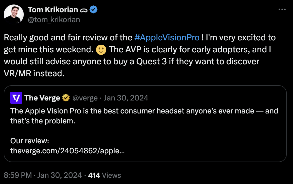 Betting on the Apple Vision Pro is not for the faint-hearted. XR is far from the easiest field in tech, but in the end, the reward will be there—that's at least my core belief and has been for more than 10 years of doing this. I know I’m not alone in feeling this way; there’s a core group of builders doing amazing work on this platform, ready to prove everyone wrong in the next few years.